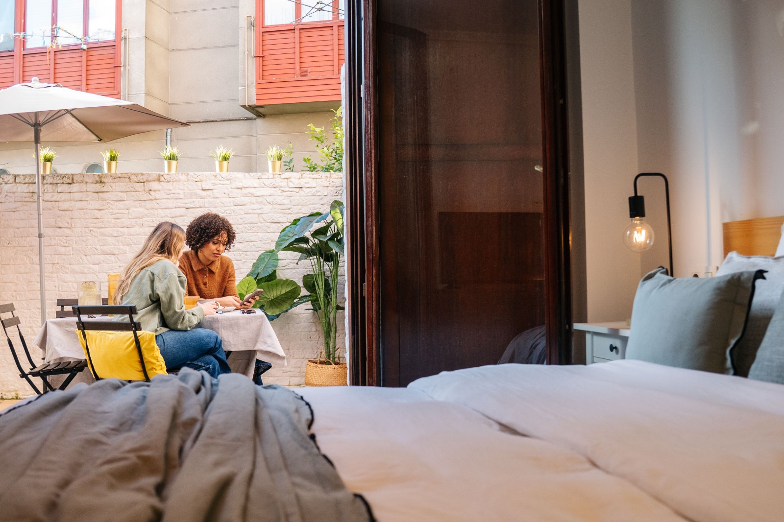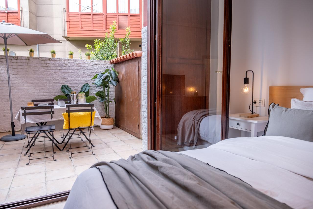 La mayor sorpresa te la llevas cuando accedes a la amplia habitación, con un gran armario empotrado y ves, la joya de la corona, el patio.